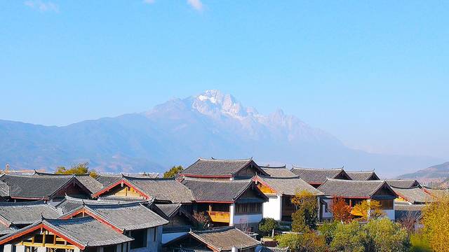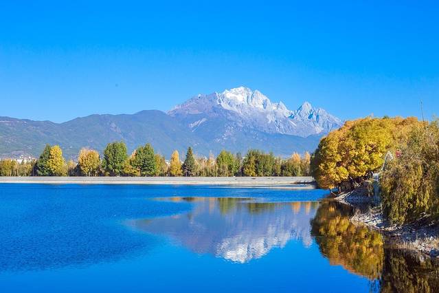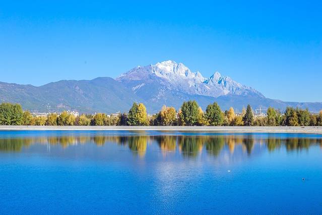 湖水倒映着远处的玉龙雪山 ,最近没有下雪,雪山还没有被完全染白。