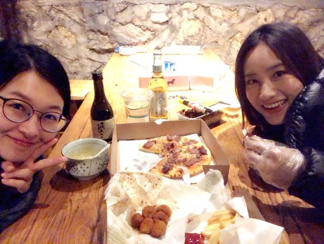 隐泉院的楼顶有个很漂亮的露台,平时这里是吃早饭的餐厅。晚上没人,我俩便拿着外卖坐在顶楼吃。