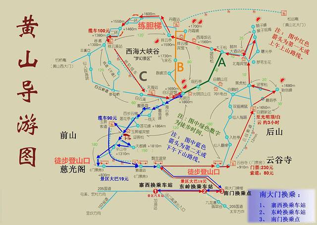 如果你们是第一次去黄山,大概都会跟我一样一脸懵。所以先甩一张超详细的黄山导游图,建议大家跟我一样打印出来放口袋里。