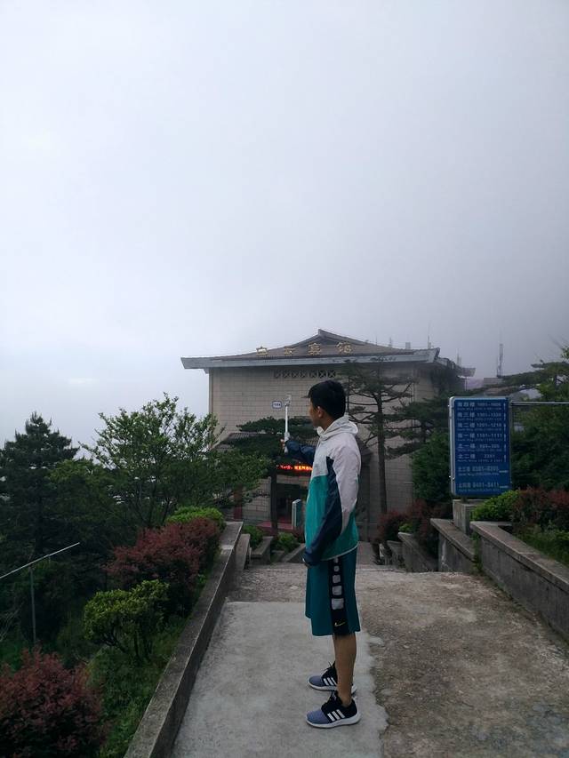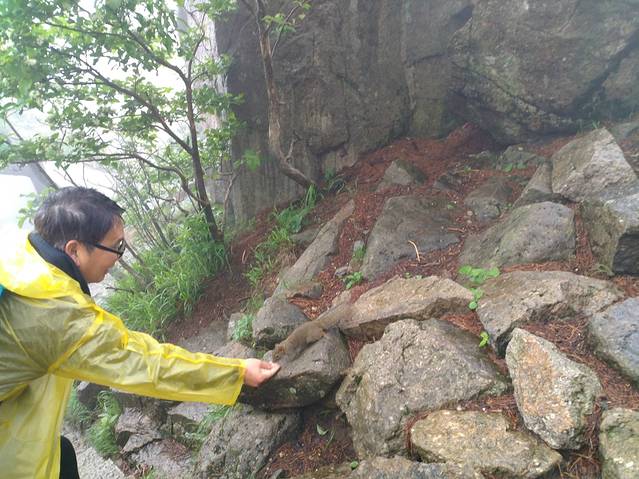 一般是从后山上,前山下,有了地图心里就有了底了,包括每个点之间需要多长时间都标注好了呢。我们是下午14:30开始上山的,可惜天气不好,到处都是雾气,啥都看不见,更别说日落了。在路边吃饭的店内买了雨衣和防滑防潮的橡胶鞋套,下了缆车后走走停停到白云宾馆差不多3个小时左右。很惊喜的居然遇见了小松鼠耶,不怎么怕人,爱吃东西,你如果有好吃的,把手伸过去,它就会上前来吃,超级萌。我公公假装手里有东西伸过去,它都凑上来闻闻了。