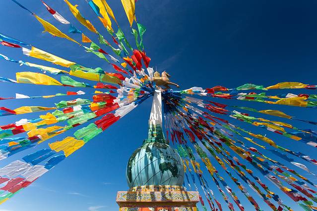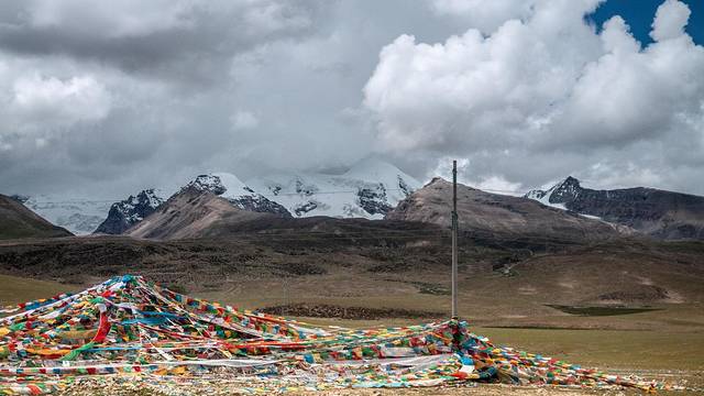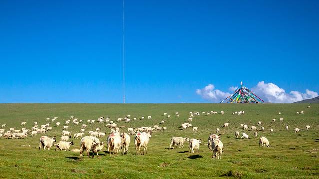 牧羊人骑着高大的骏马喊着号子,呼唤暮归的羊群;草原被围栏围成若干个方块,每个方块的草地都各有归属;巨大的经幡塔和风马旗立在草原的高处,被风吹得扑楞楞地响着;提醒着人们这里藏区身份。