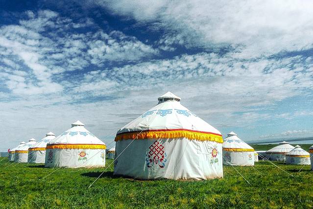 青海湖流域主要是藏族居多,也有部分蒙古族。他们在临近湖边的开阔处搭建起整齐的蒙古包,由木架、羊毛毡、马鬃绳制成,呈天幕状,用于接待游客,草原上的风吹得毛毡猎猎作响,有种征战前的雄壮苍凉感。