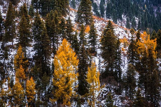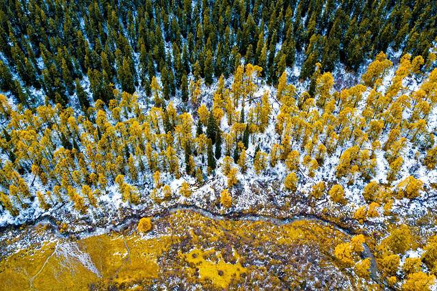 前一夜的暴雪让整个鹧鸪山堆满了积雪,秋与冬的盛宴在这里交替,让人有一种另类的魔幻感。我们开着车向鹧鸪山驶去,沿途所到之处,让人想举起相机。或许在这一刻我举起相机才明白朋友曾说: 川西 总是让人欲罢不能的想去。