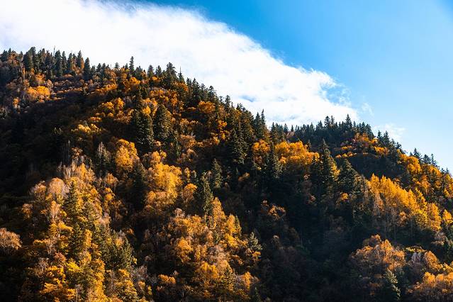 也不知道从什么开始,大家开始发现 川西 彩林特别美。 米亚罗 彩林当属其中的翘楚。一脚油门就开始往 米亚罗 开。路上小猪总是喜欢带着我停在路边上撒野尿,有时候停的地方比较野,有时候停的地方又比较漂亮。