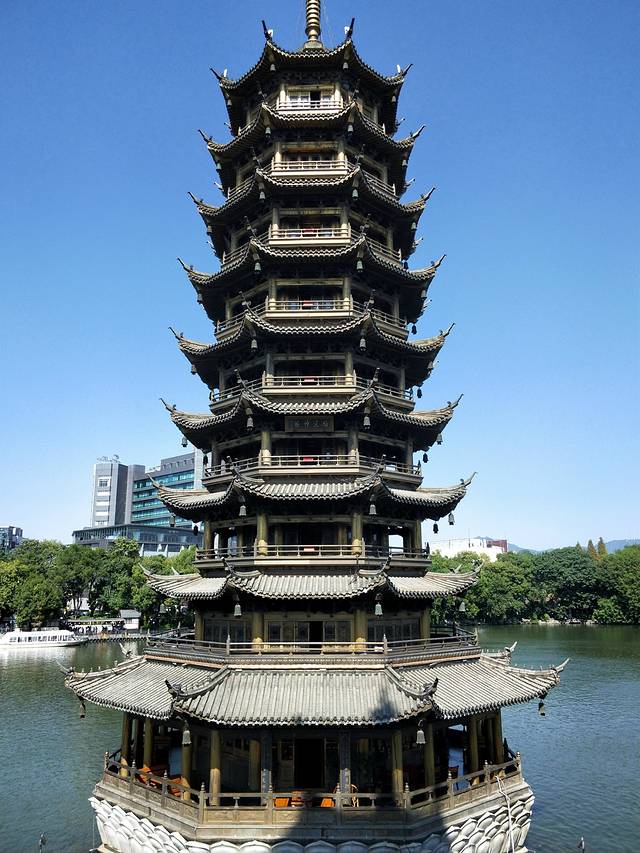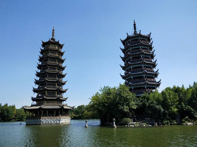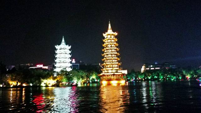 “日月双塔号称世界第一铜塔,是桂林旅游的一个夜景观赏地。其中日塔高41米共九层,通体均为纯铜装饰,耗用铜材350吨,并有电梯供游客观光乘坐” 摘自百度