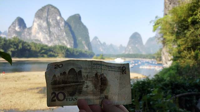 下船之后坐电瓶车到兴坪古镇(切记,坐竹筏的票一定不要扔了,有这个票才能上车)途经20元背景