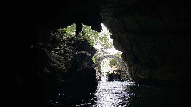 进山洞了,进洞了以后里面没有灯,黑麻麻的,不骗人,真的没有灯,不知道撑船的是怎么开的~~