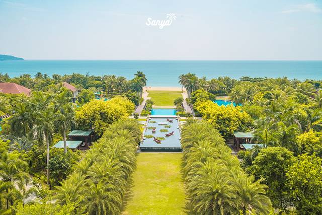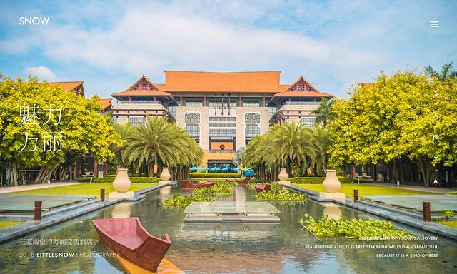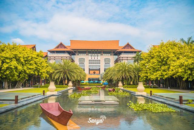 绿荫如盖,水清如镜,空气中混合着大海和花草树木的清新味道,在这片水池对面便是万丽酒店主体,这一座红瓦琉璃建筑,恢弘大气充满复古气韵。酒店总建筑面积10.5万平方米,主体建筑由 美国 著名公司Willson&Associations设计,室外园林设计由 香港 公司BeltCollins担纲,融合 中国 传统宫殿文化和热带风情,相比高楼大厦,这样的建筑给人感觉更加亲切。
