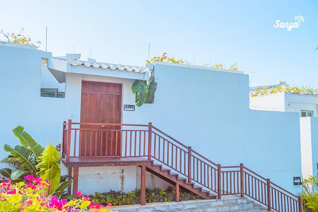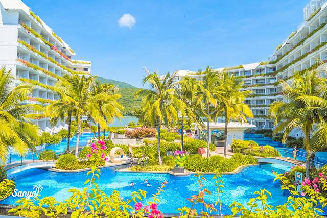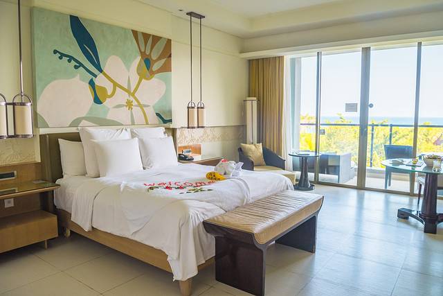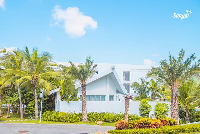 临海 而建的酒店当然拥有最佳的观景视角,从酒店顶层的阳台看去,酒店的风景尽收眼底,视线里只有一片天蓝和葱绿,干净的画面让人移不开眼。酒店呈对称式设计,大片的椰树也是这里的特色之一,热带气息浓厚。