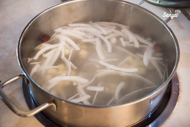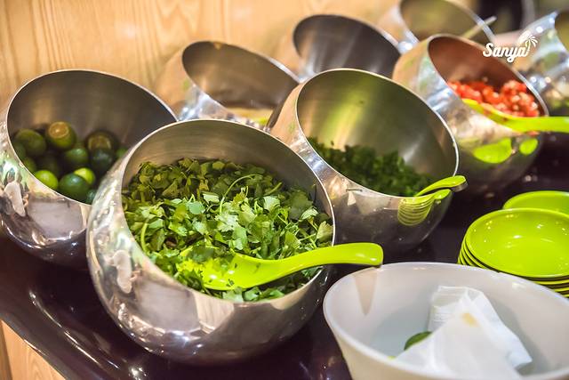 首先端上来一个椰汁清 汤原 味锅底,里面已经倒入了一整只椰汁,在汤底即将煮沸的时候工作人员会再拿一个椰青倒入进去,椰汁的清甜香味扑鼻。