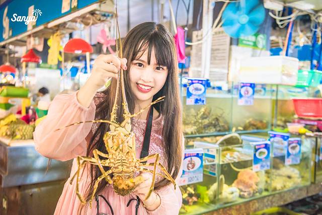 我们步行几分钟到海鲜市场去选购自己喜欢吃的海鲜,看到巨大的龙虾忍不住一把捏住它的胡须拽了上来,哈哈,调皮如我。
