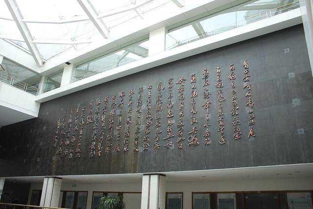 走进石雕博物馆,便是展馆的二楼,第一层是商铺。在馆里的长廊里游走,所到之处,都有一种浓浓的文化底蕴。那墙壁上用铜刻的字苍劲有力,又如铁骨铮铮的汉子看着非常精神抖擞。