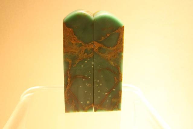 有一印章底色呈绿色,中间穿插着的黄色部分犹如一只凤凰,两枚印章为一对,将两枚印章合并在一起,便像是章上刻的两只凤凰相对而飞。在往里走,还有四脚的香炉,貔貅,以及一个小小托盘上放着5-6枚印章堆在一起。每一个石雕雕刻的都很有立体感,镂空,简洁有致层次也是极为分明,它仿佛跨越了时空,凝聚了青田石雕的魂与魄,展示着青田石雕的文化内涵。其雕工精细程度让人叹为观止。