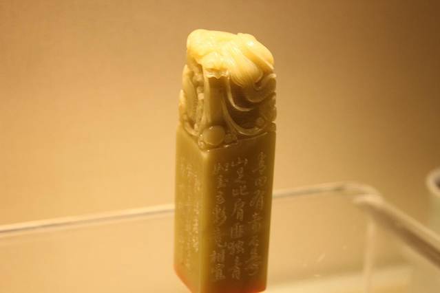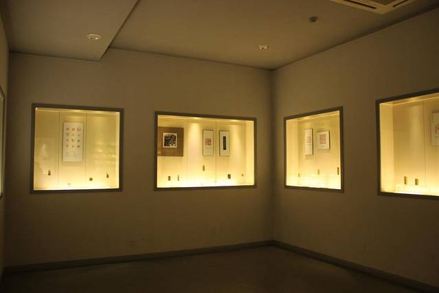 从展厅的入口进去,便是长长的走道,墙内砌着几个方形的洞,墙上挂着画,框里是暖黄色的灯光看起来几分温馨,画底下的塑料脚撑上放着几个玲珑别致的印章。想来以前那些文人墨客在自己的墨宝上留下的印记便是这些印章所篆刻的。每个印章上都刻着小小的文字,细节做的极为细致,小巧而不失精致。