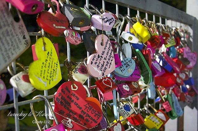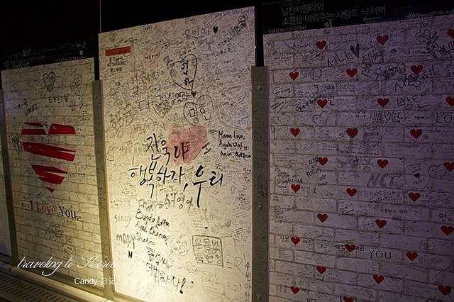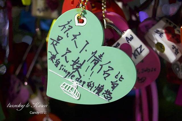 首尔塔的爱情墙上真的有好多人写的字,韩文居多,完全看不懂是啥。