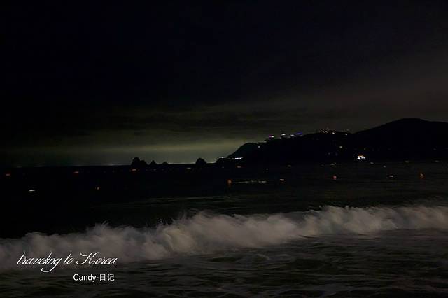 万万没想到你的海边很漂亮。大概是灯光的原因,远处山峰看上去有一种绿色和红色混合的光芒,看着漂亮极了。