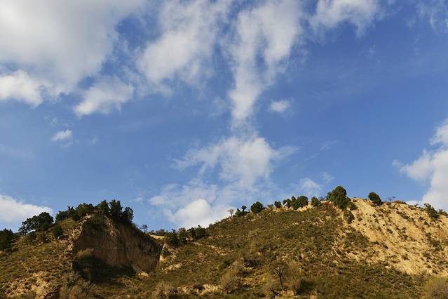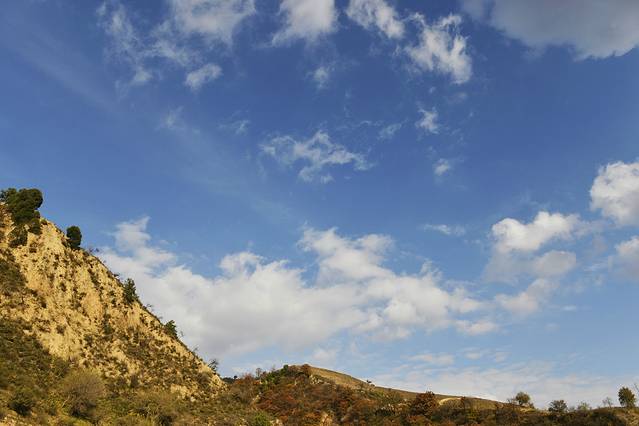 当到达龙巴沟峡谷外围停车处后,天气突然由半阴半晴变得晴空万里,蓝天白云下的这片峡谷在温暖明媚阳光照耀下,呈现出既有黄土高原的苍茫粗犷,又有深沟坡上秋色的妩媚多姿。一片煞是动人的陕北风光大好画面!而这也正是发现这几条峡谷所在的这特有大地理环境。