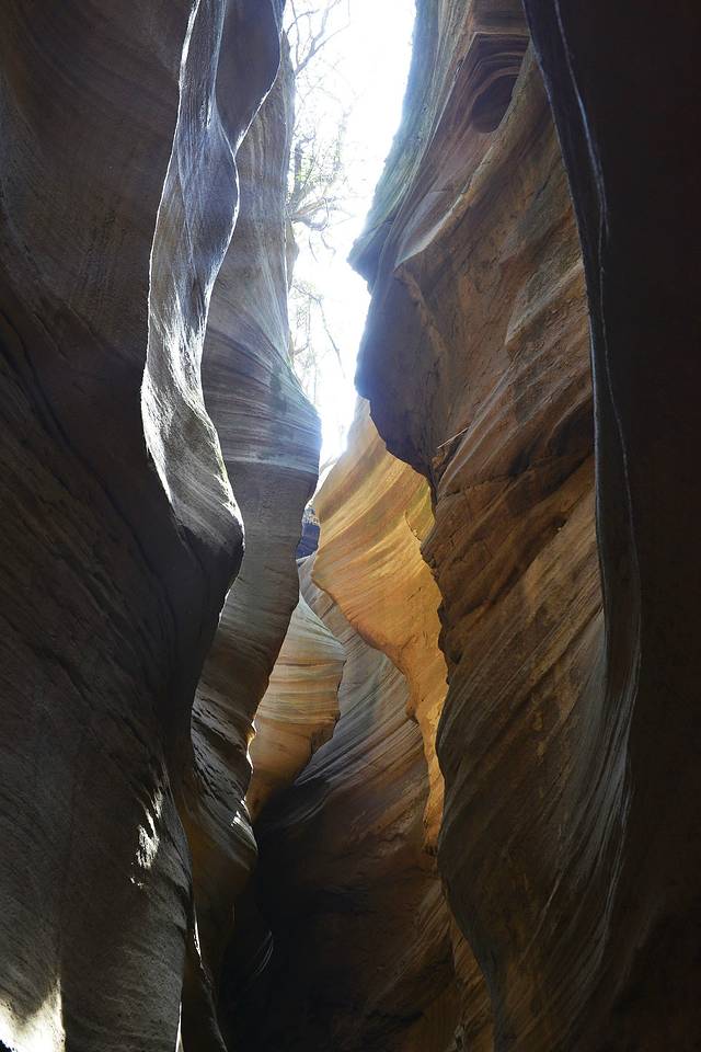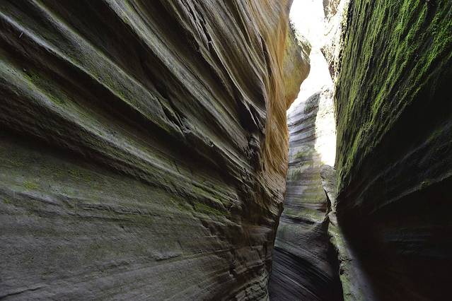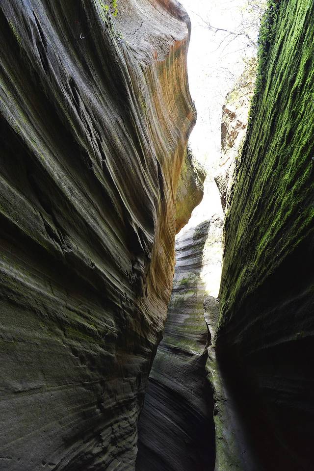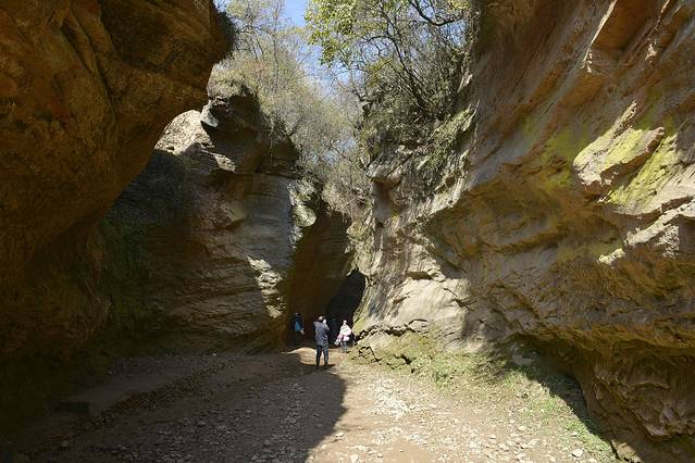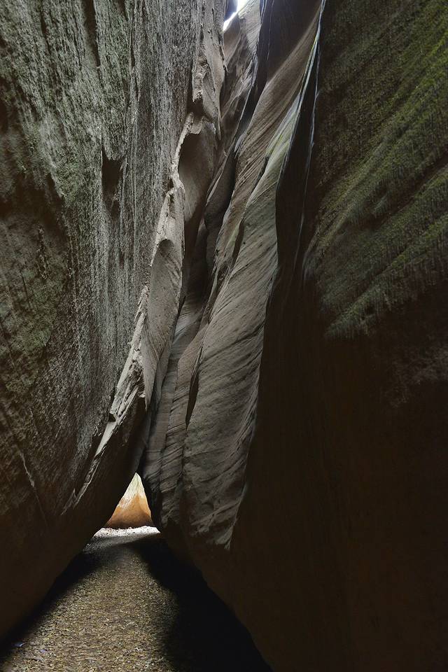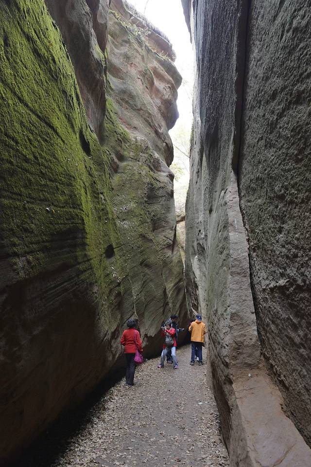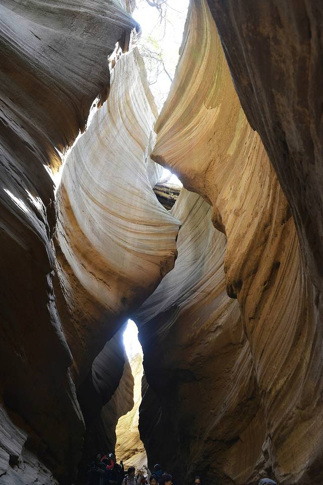到了一线天峡谷跟前,要通过一个非常狭窄低矮的入口,才能进入到这段沟壁险如斧劈、沟宽窄如一线的景点,美中不足的是沟长度很短,不到200米吧,里面虽不见积水,但特别阴冷潮湿。