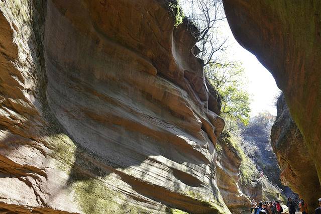 尽管沟里一路泥泞,必须在沟上花5元钱租雨夜才能游沟,但如此才更令我们兴致盎然。当天中午桦树沟游人络绎不绝,在沟中狭窄 通道 十分拥挤,只能慢慢排队通行。我只能克服拥挤人多的不利,边趟水路前行,边手机单反轮番扫射沟里大好丹霞地貌特有的迷人风光。以下就是我进入桦树沟的一路掠影: