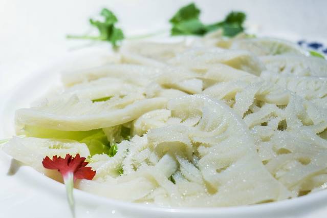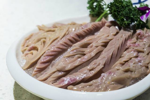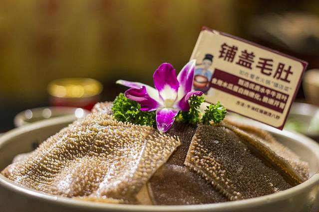 铺盖毛肚,采用的新鲜牛毛肚,我们平时吃的白色的毛肚都是经过了漂白的,这个黑色的毛肚才是他原来的样子,精挑细选,端上来的毛肚都是大片大片的,放入火锅中涮几下就能吃了,脆爽脆爽的,很满足的口感。