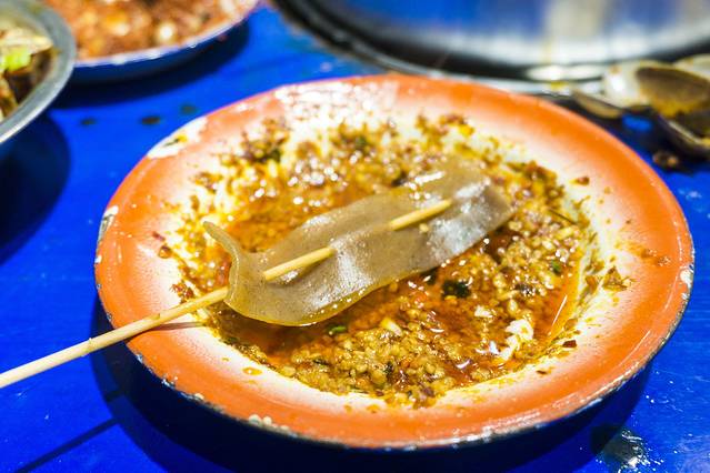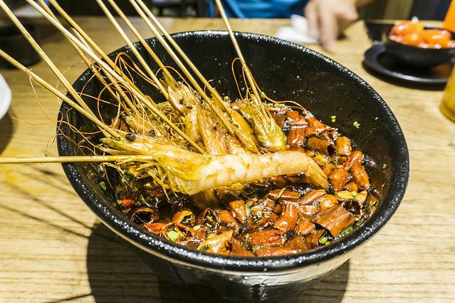 裸奔坨坨虾,名字非常的有趣,倒也是很形象,虾壳已经提前剥去,用竹签串起,食用起来简单方便,这个虾是新鲜的,沿 海地 区的人对于海鲜可是很挑的,这个虾肉质Q弹,肯定是鲜活的没错,终于见到辣椒了,这才是 成都 该有的味道嘛,麻辣鲜香,推荐。