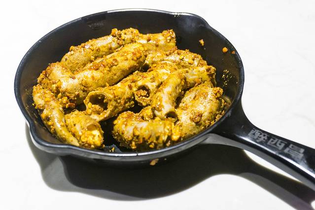 猪小肠,第一次尝试,这个不是那么的好烤, 油脂占了一部分,小肠又很薄,怕是没烤熟,烤过了又会变得很硬,味道嘛,不喜欢吃内脏的朋友也可以来尝试下,带有嚼劲,余香回荡。