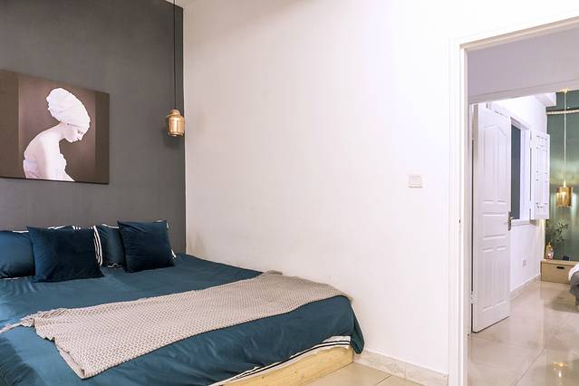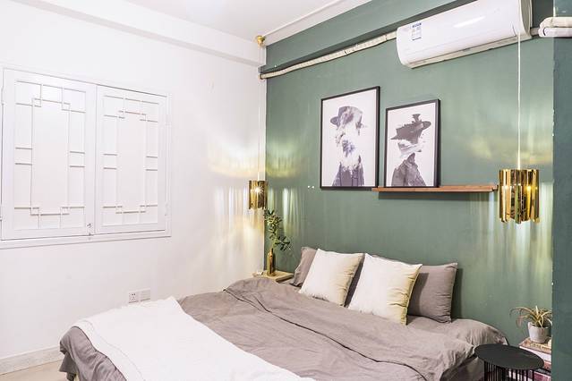 其中的一间卧室和客厅是通过一个木质窗户相连的,可以适当的增加卧室的宽泛度。