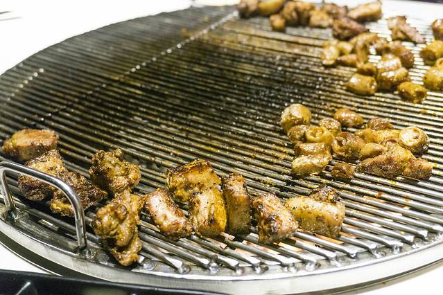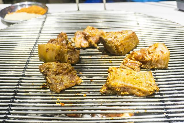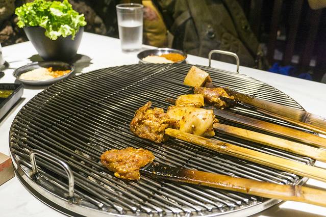 竹签大串也就是端上来的时候好看些,放上去烤的时候,竹签就直接取出了的,猪肉滋滋冒油,香味弥散开来,真香啊,炭火的功力也是足够的,烤肉的速度很快,腌制过的猪肉 本来就带有酱味,肥的部分油脂已经烤出来,就像是猪油渣一样焦香焦香的,很不错。