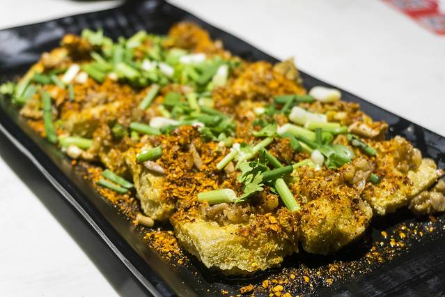 包浆豆腐,外表酥脆,里面非常的嫩滑,一口下去浓浓的豆香,不知道为什么,以前我是不吃辣椒末的,这次来 成都 ,竟然爱上了干辣椒的味道,口齿之间还有一股清香,很熟悉的味道,却想不起来是什么东西,特意扒拉扒拉,才发现,原来上面的调料里还加入了折耳根的小粒粒,起到了很大的调味作用,有些人会觉得折耳根的味道大,然而在 四川 貌似大家还都挺爱吃的,我也觉得味道不错,看来我确实是 成都 娃子。