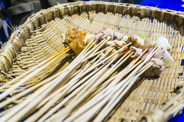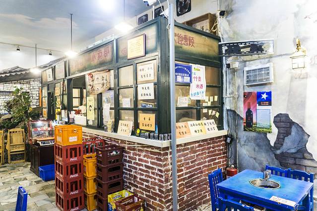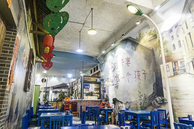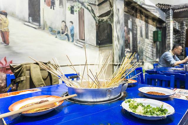 走进里面更是充满了怀旧的味道,蓝色的小桌子小板凳就像是幼儿园里面一样,大家坐在一起吃东西,整个氛围就像是上个世纪的大公社一样(虽然我不知 道真 正的大公社是什么样子,想象中应该就是这样的吧),这样的画面十分的有趣,人多吃东西也是非常的热闹,虽然是隔壁桌的,但是就在旁边啊,食欲也是很被感染的,大家坐得都比较密集,有时候去拿串串都是需要绕好几个弯弯。