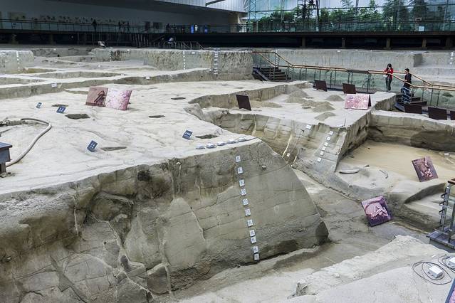 金沙遗址博物馆分为了遗迹馆和陈列馆两大部分,遗迹馆的部分和 西安 的半坡遗址博物馆非常的类似,但是半坡遗址发现的较早,几乎是已经考古完毕了的,博物馆就是看看土坑,金沙遗址是2001年才被发现的,博物馆是2007年对外开放的,虽然也是看土坑,因为多了陈列馆这部分,所以金沙遗址博物馆还是比半坡遗址博物馆有趣一些,而且这里还有很多的藏品可以看到。