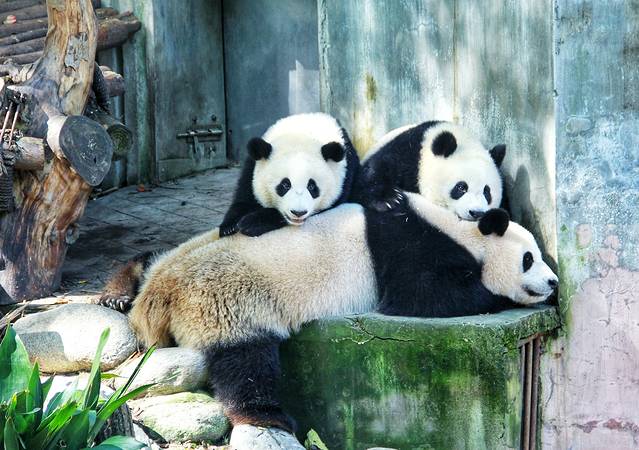 这应该是一家三口,熊猫妈妈在睡觉,上面的两只熊猫宝宝却一直在打闹玩耍,无奈的熊猫妈妈已经被挤到了边缘,看得出来她是真的很困,眼睛都是属于努力睁开的状态,而两只熊猫宝宝真的就是两个熊孩子,精力旺盛围着熊猫妈妈打转,大家也是看的很开心,我在这里也是足足停留了半个小时之久。