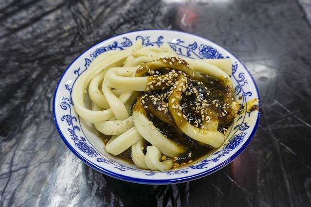 甜水面,第一次尝试,点单是时候问老板娘这是什么东西,老板娘给的形容是有点咸有点甜有点辣,我实在想不出这样的味道,不过她强烈推荐,我就要了一份,果然是又咸又甜又辣,混合的味道,没有觉得奇怪,还很好吃呢,而且这个面条非常有劲道,裹上酱汁很美味,我竟然非常喜欢这道美食。