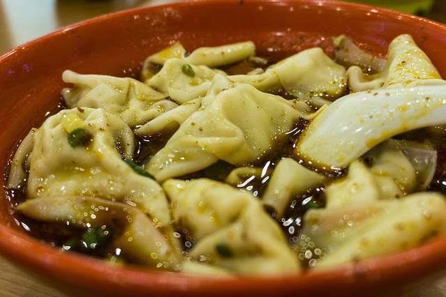 那么抄手到底是什么呢,形状像是馄饨,包法像是汤包,里面的馅又是纯肉的,又像是饺子,所以啊中华美食是无穷的,哈哈,抄手必须是红汤的才是正宗的,来到了 成都 ,我的胃也调成了 成都 模式,大清早的就吃辣,完全没问题啊。