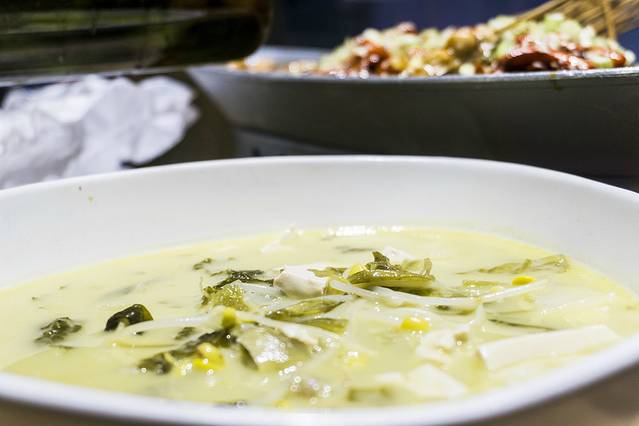 一鱼两吃,点了烤鱼片,这道酸菜鱼是默认的菜品,菜单上没有显示,但却是包含在一起的,注意哦,鱼肉做成了烤鱼片,鱼骨和鱼头做成了酸菜鱼,汤头浓厚,酸酸的口感很是开胃。