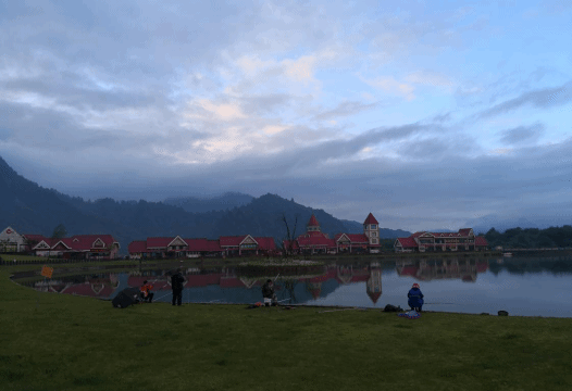 收拾好东西,去映雪广场的小吃街吃晚饭,一排排红房子伫立在映雪湖旁边,背后的青山已是深秋的枯黄,映雪湖倒映着深沉的暮色,湖边有人在悠闲的钓鱼。