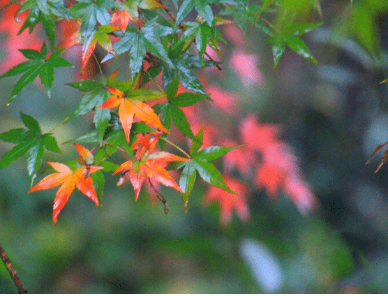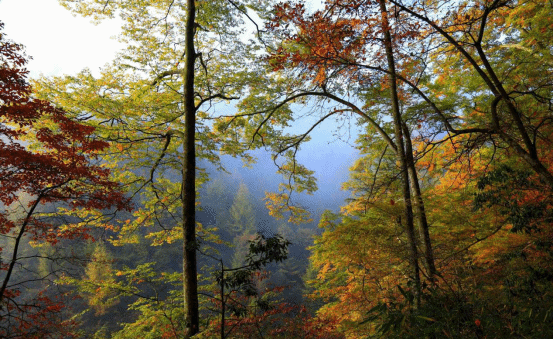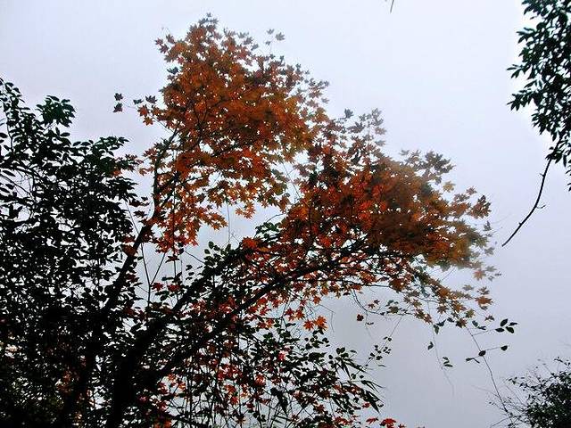 西岭前山的红叶不是“万山红遍,层林浸染”,而是“红叶绿中游,彩练舞秋风”。就像是大染缸被打翻了一般,随意泼洒,泼出冷了西岭前山秋季的五彩斑斓,不仅仅是满山红叶而是枯绿,橘红、鹅黄、白垩相映成趣,犹如一张彩色的画布包裹着山峦,与山间袅袅云雾交织在一起,呈现出一种梦幻般的不真实的美。