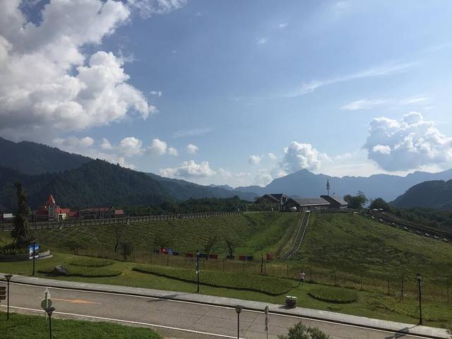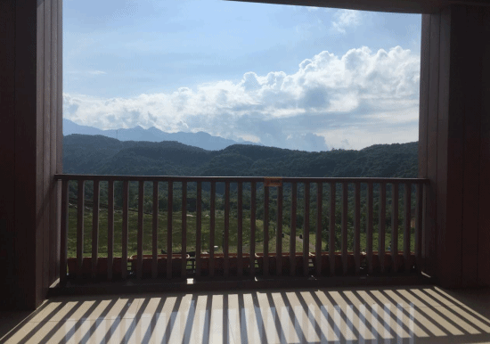 从房间窗户望出去是一大片泛黄的草坡,远处的山景在傍晚时分是一片朦胧的苍绿。
