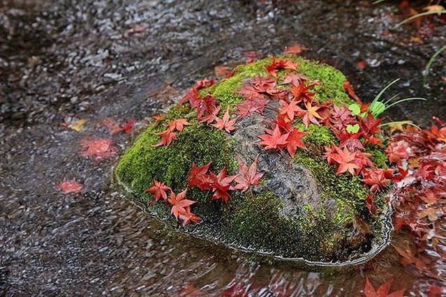 红叶落在青石板路上、水边的石头上、溪水上,又打着旋儿飘走了,好一个“风抚叶飘飞似花,碎影流彩似丹霞”,一簇簇、一团团的浓墨重彩是西岭雪山秋的画作者。