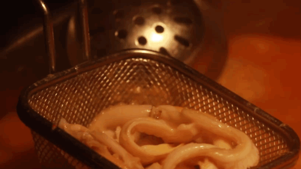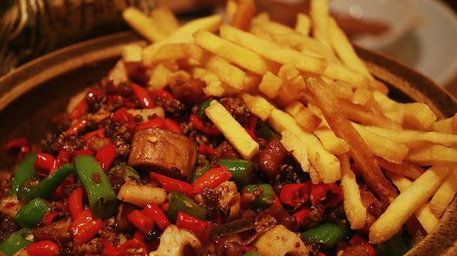 “之前你做的辣子鸡,应该再滤掉汁,炸干一点,加上些薯条,像这个一样才好吃。”