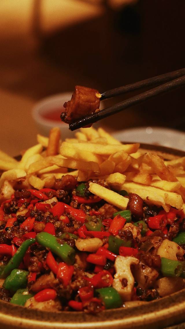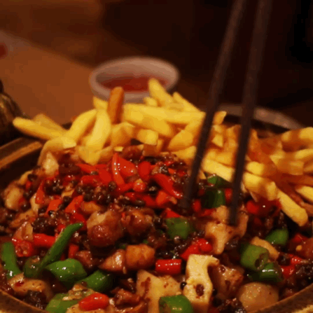 一斤辣椒两斤鸡,鸡肉的分量丝毫不含糊。鸡切小块,加青椒、红椒、盐、料酒、蒜等调料反复翻炒入味,配花生米酥脆香浓、面条和薯条解辣又带来不同口感、菌菇也咸香入味