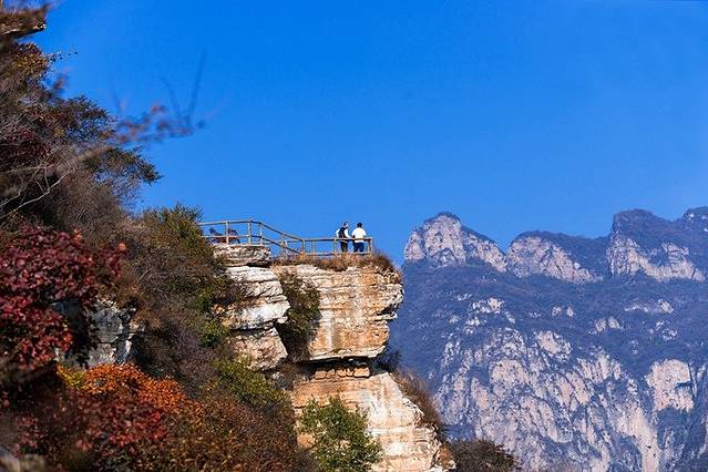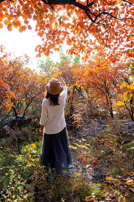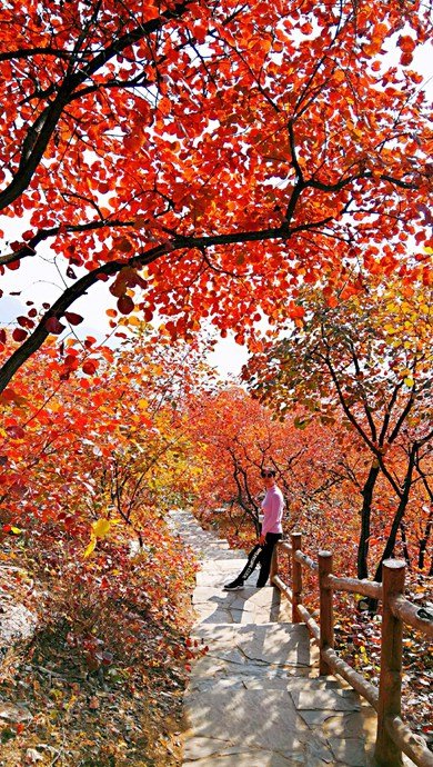 从山脚向上缓缓攀登,五彩花叶将红、黄、绿交织在一起,叠放出油画般的绚烂层次,一路美景走走停停也不觉得累,终点处的鹰嘴岩饱览河山风光!
