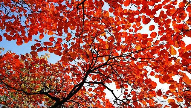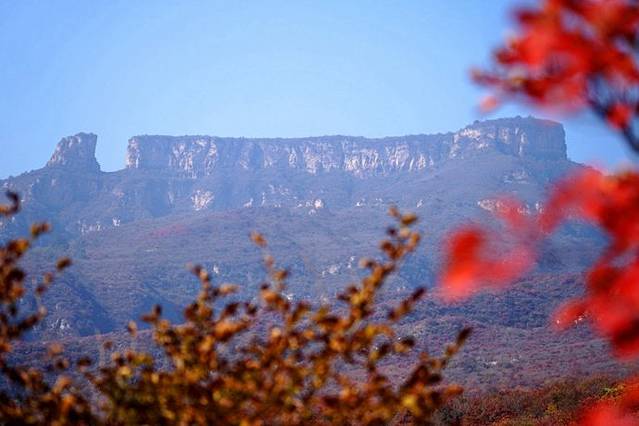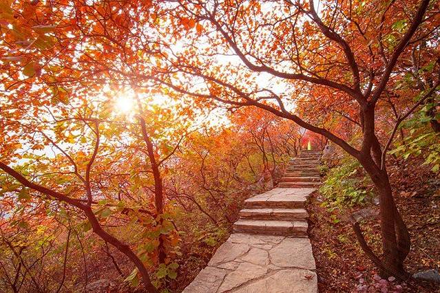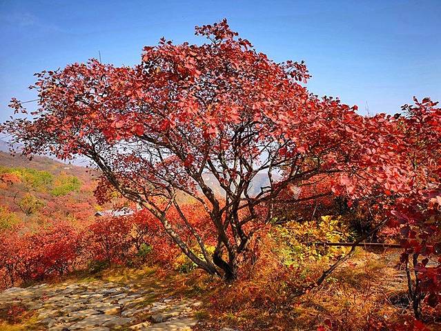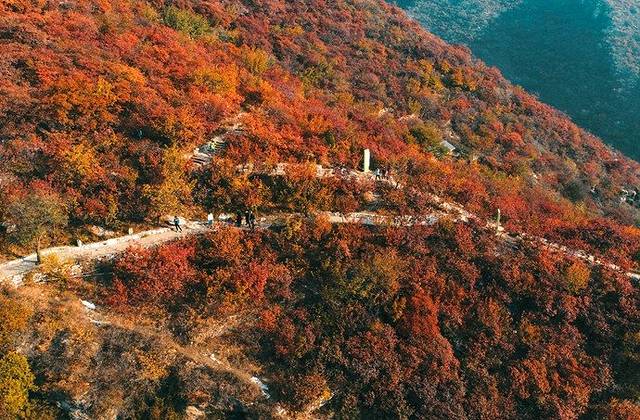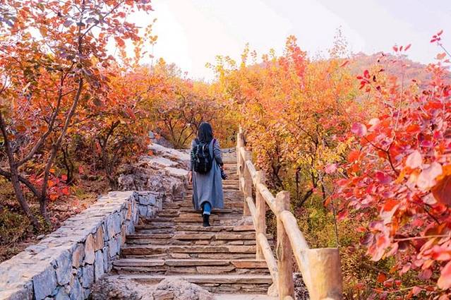 漫山遍野的黄栌,好似领头的将军一般冲在色彩的最前沿,火一样呈现出秋日里最温暖的红色,将一座又一座山坡染尽浓郁与娇艳。