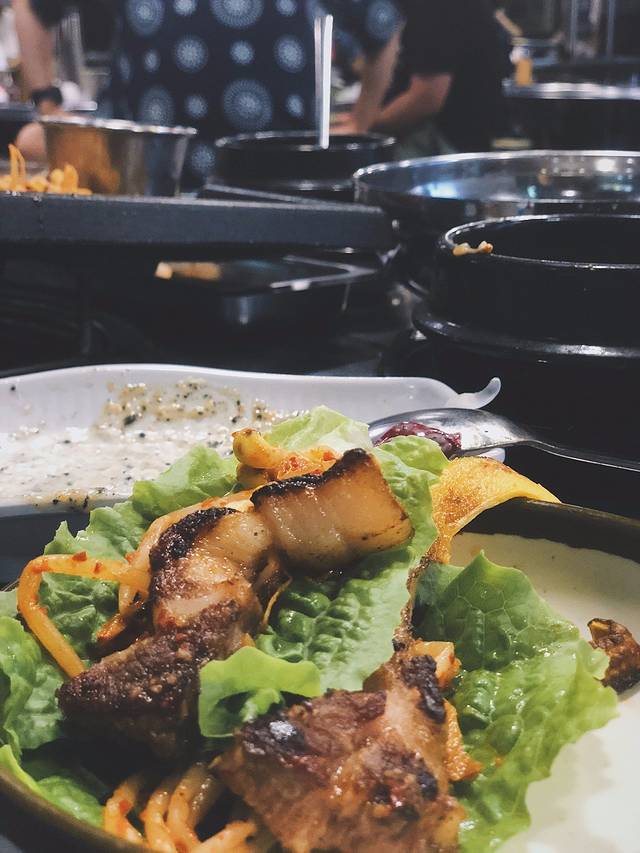 这个黑猪肉还真是的好吃,口蘑和洋葱烤出的香气瞬间席卷了整个鼻腔,剪成大小合适的肉段,从白色逐渐变成了诱人的金黄色再到焦糖色,伴随着的还有油在铁板上跳舞发出滋滋滋的响声,夹上一条,蘸一点酱料,用苏子叶卷起,顺势放入口中,肥而不腻的黑猪肉混合着苏子叶的香气和特制酱料的辛辣,口感丰富到难以形容,只能是先吃为敬了!