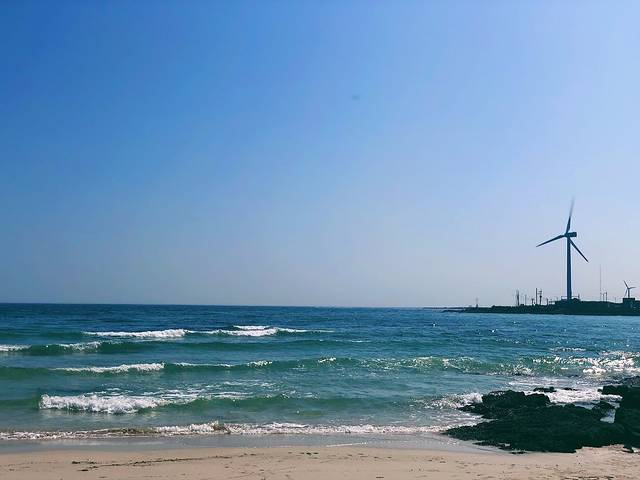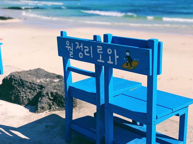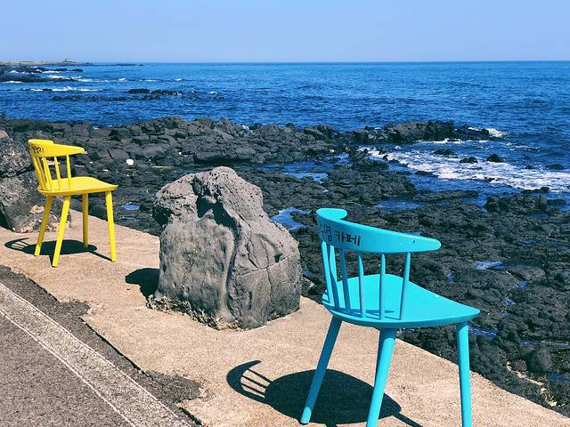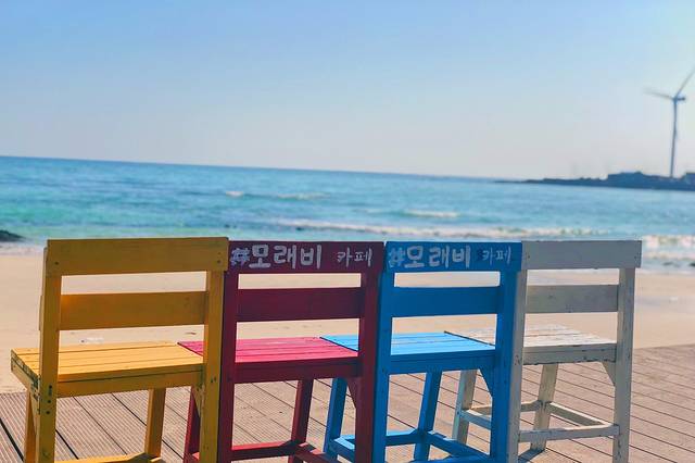 月汀里,可以说是 济州岛 最浪漫的地方了,白色的大风车,细沙、礁石、咖啡馆,仿佛在讲述一个动听的爱情故事,每一眼都是韩剧中的场景再现,网红的彩色椅子,只是立在那里,就十分美好。