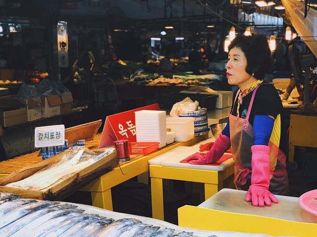 在鱼摊画着精致妆容的阿姨,这可能真的是 韩国 人的一种生活态度吧,对自己的精致,也是对他人的尊重