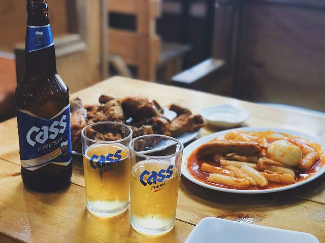 【贰】找一家小店,尝一口本地特产的啤酒,配着香酥可口的炸鸡,别忘了欧尼们最爱的辣炒年糕和鱼饼,哦,对了,还有特别出名的炸酱面