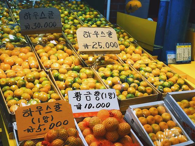 市场里的各种蔬菜和新鲜的橘子,这里的大个桔子都是按 个 卖的,大概10—60元人民币,对,超级贵了~