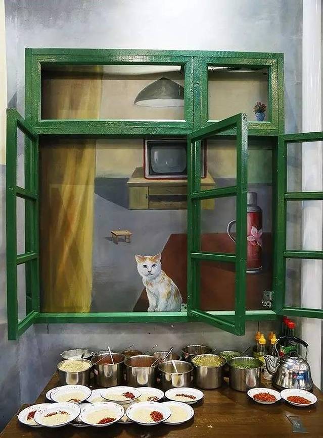 马路边边主打的就是怀旧情怀,还未进门就听到了怀旧的经典曲目《别问我是谁》、《999朵玫瑰》等等,虽然小编是90后,但是对于这些曲目还是朗朗上口的,一下就好像回到了自己的小时候。与墙上的壁画交相呼应,这里的每一个场景都可以都可以在自己童年的记忆里找到影子,拥有最单纯最美好的记忆,现在也着实让人怀念那段时光。马路边边,灰砖红瓦石头墙,小卖部,泛黄的路边灯。