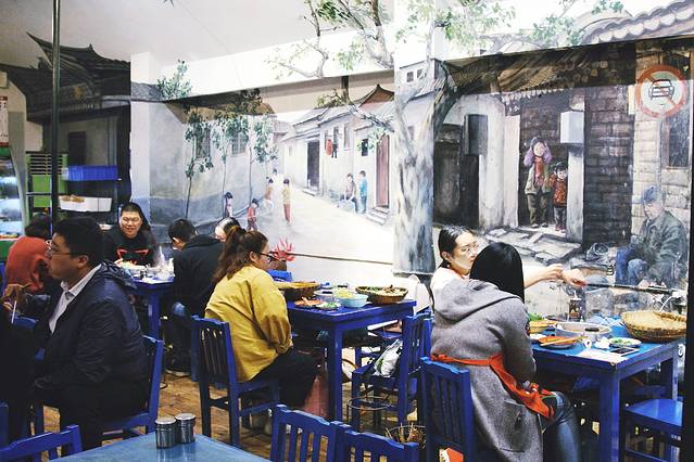 虽然大门口非常简单的装修,就像“苍蝇馆子”的感觉,但是一进去就被墙上的壁画所吸引了,有一种七八十年代的复古感,但是也有一丝童趣。而且所有的餐桌椅都是蓝色木质的小方桌+小板凳,讲真,我第一次在这种装修风格的地方吃串串,觉得特别又怀旧,就像小时候玩过家家一样。